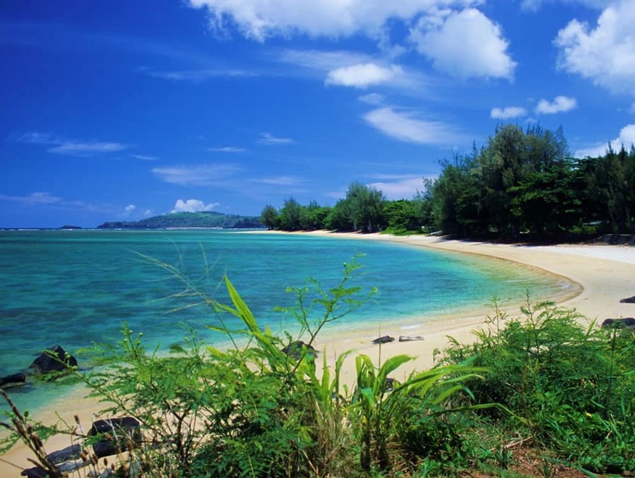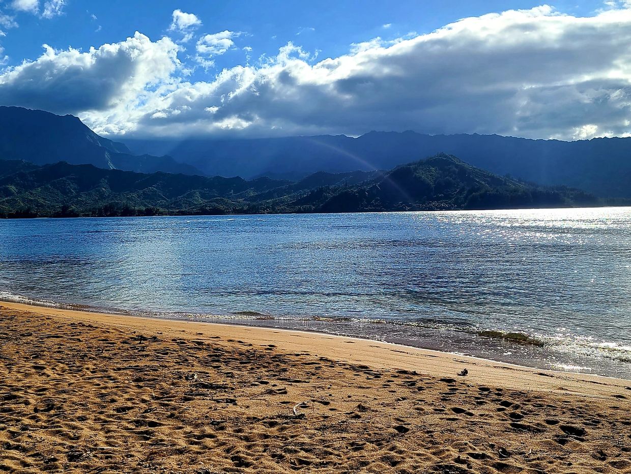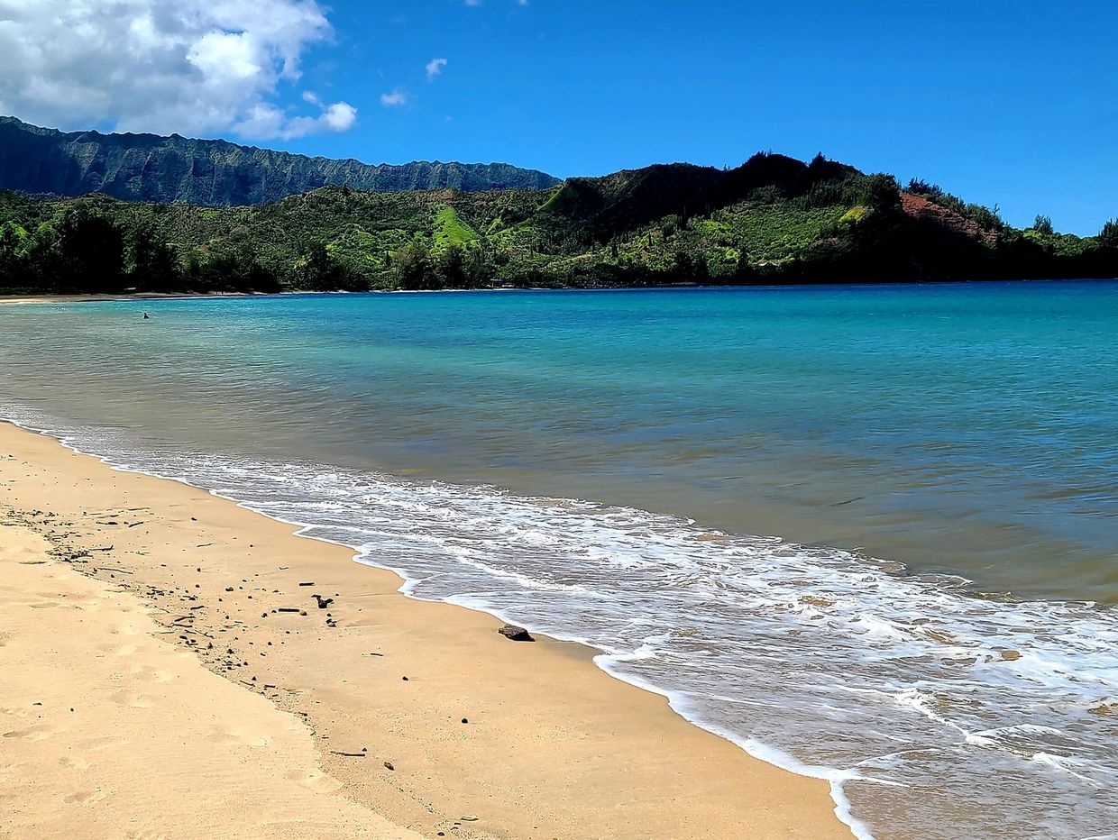 Hanalei Bay has a two mile beach that is one of the best beaches in the world. It has beautiful views of the Nāpali Coast, is easy to access, is a very good swimming beach, has excellent surfing, and has a pier that is both picturesque and fun (you can jump off the pier into the ocean, then climb back up).